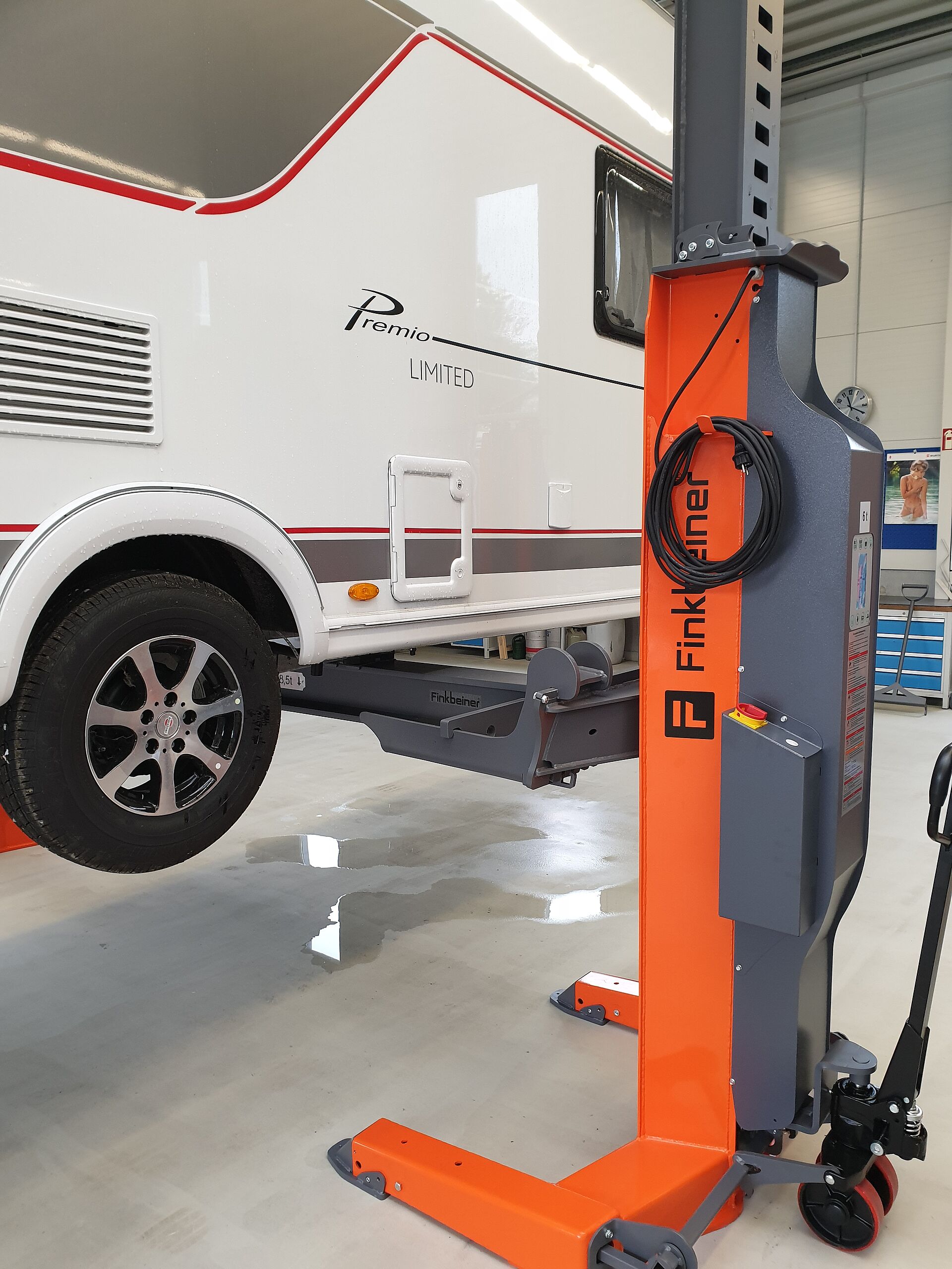 Mobile column EHB903V11DC-FEX with a capacity of 3 t each for vehicles with inboard wheels such as motorhomes or vehicles with a large superstructure having an axle weight of up to 6 tons. The wheel forks are 500 mm long. Maximum 10 columns can be composed to operate as a lift set: